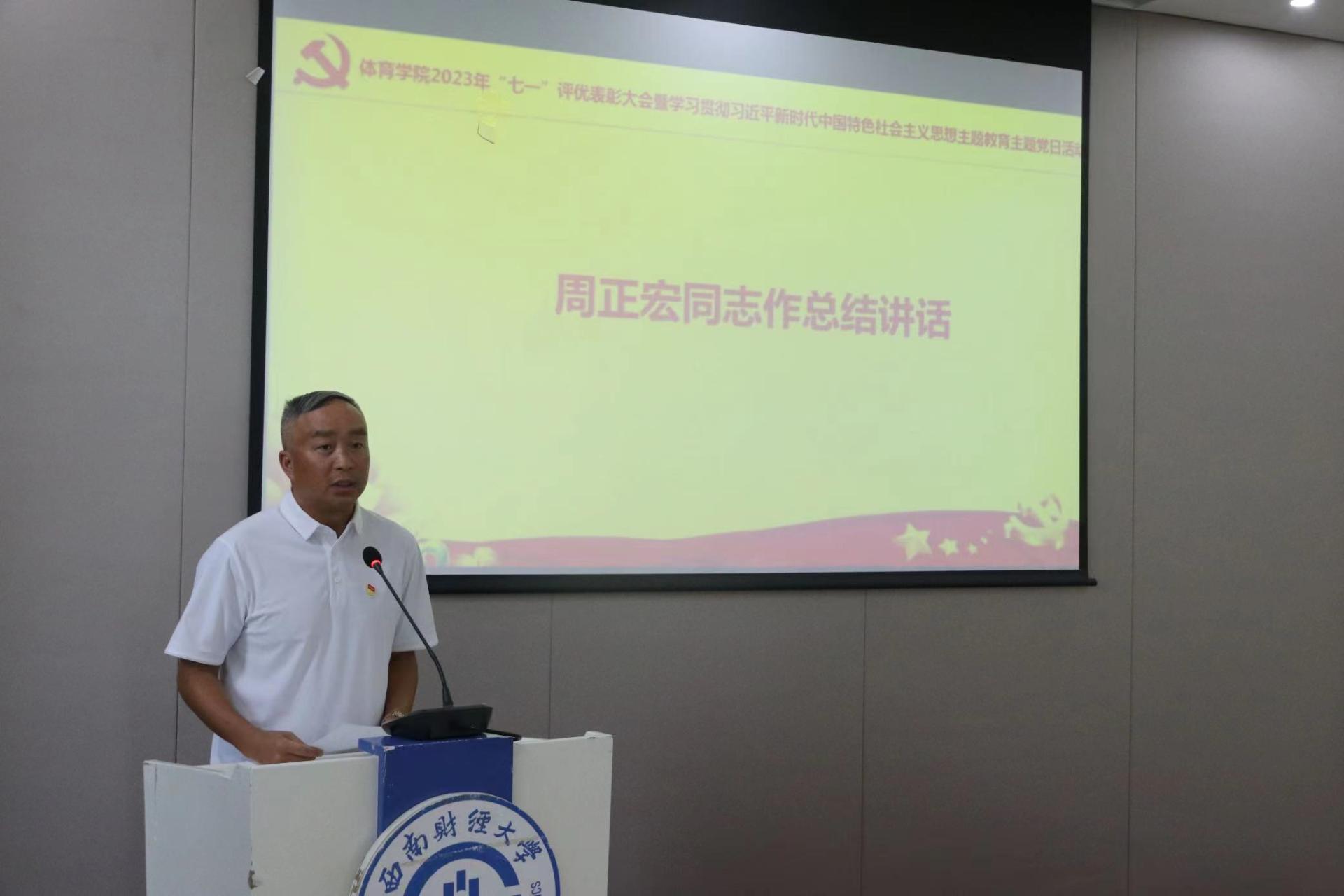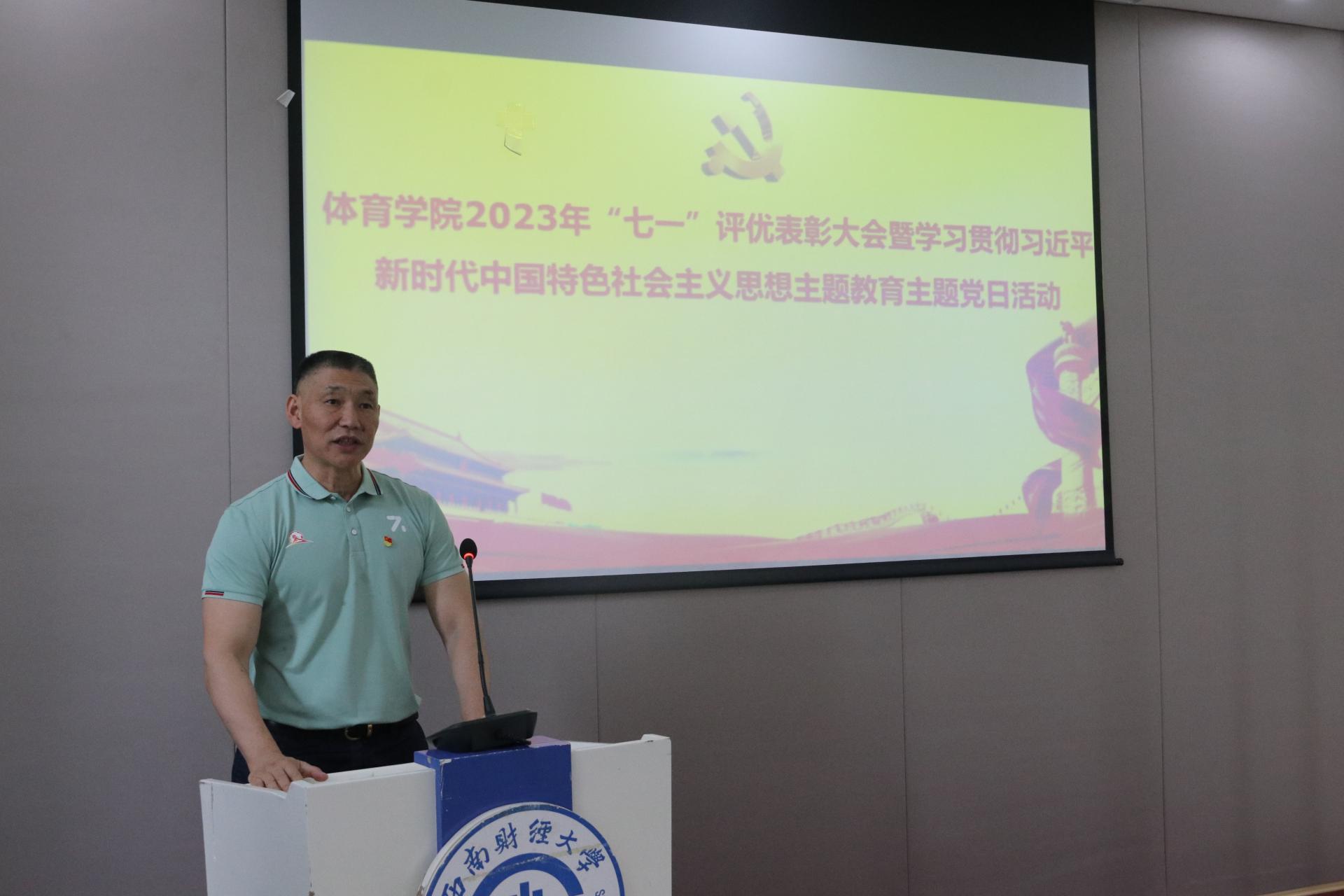 党委书记周正宏在发言中简要总结过去一年在学校党委的坚强领导下,西财体育人全面贯彻党的二十大精神、推动学院事业高质量发展取得的阶段性成果,并向奋斗在一线的师生党员致以诚挚的问候,向受到表彰的师生党员表示热烈祝贺。周正宏指出,学院党委坚持把高质量开展好主题教育作为重大政治责任,迅速行动、精心组织,坚持高标准、严要求,在深入推进理论学习、调查研究、推动发展、检视整改等方面取得了积极进展。就进一步推动主题教育走深走实,周正宏提出“四心”的工作要求,希望全体师生党员始终保持学习心、忠诚心、实干心、奋进心,在“学思想”中擦亮信仰底色,在“强党性”中擦亮忠诚底色,在“重实践”中擦亮公仆底色,在“建新功”中擦亮拼搏底色,在新征程学院体育事业高质量发展贡献力量、再立新功。