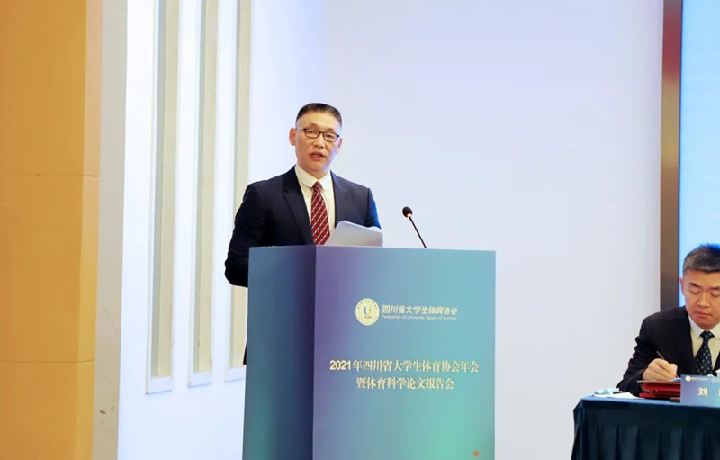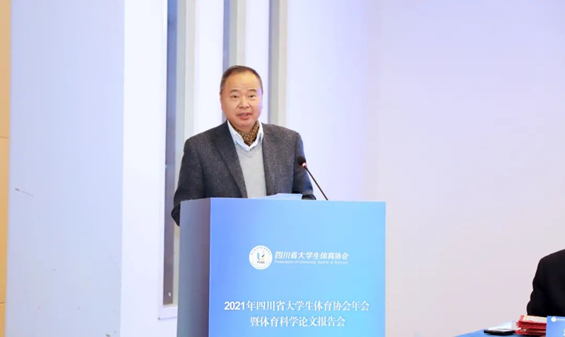 陈朝先代表省委教育工委、教育厅在大会上讲话。他代表四川省教育厅对年会的顺利召开表示热烈地祝贺。陈朝先指出,2021年四川省学校体育工作取得了显著成效,主要表现在学校体育工作的顶层设计不断完善、足球育人成绩显著、以“贡嘎杯”为代表的品牌赛事日益成熟、高校担当积极作为、体教融合在实践中深化。陈朝先强调,成绩取得的同时也要看到问题的存在,如高校学生体质健康监测数据比基础教育阶段明显偏低;多数学校未能落实全学段开设体育课及体测达标方可毕业的要求;高校服务地方经济社会发展动力不足、能力不足等。最后,陈朝先对到会的高校新利在线平台书记、院长提出殷切期盼, 一要牢记育人初心使命,坚持“健康第一”教育理念;二要对标竞进改革创新,努力实现自身进步和体育工作整体提升;三要服务地方担当作为,支持地方经济社会发展与基础教育阶段学校体育工作。