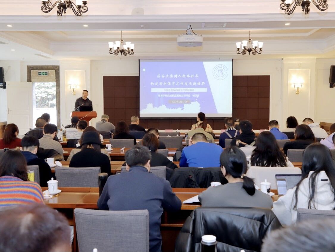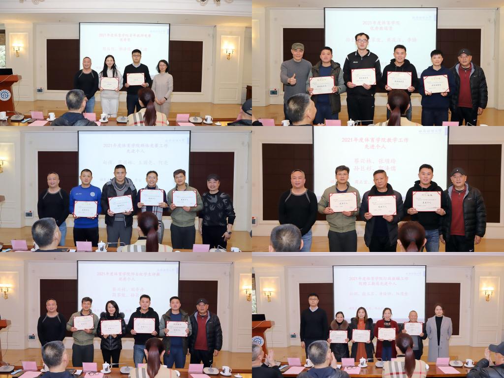 在随后召开的新利在线平台2021年年终总结会上,院长兼直属党支部书记杨远波就学院2021年度工作总结和2022年度工作思路及举措作报告。他指出,2021年是全面建成小康社会和“十四五”规划的开篇之年,也是实现第一个百年奋斗目标的决胜之年,全院教职工对学院各方面工作建设的辛勤付出和卓越贡献。2022年,学院要围绕贯彻落实学校第十三次党代会和第十三届二、三次党代会精神,深入推进党的建设,扎根中国大地,瞄准世界一流,聚力改革创新,将体育纳入全面实施素质教育的各项工作中,落实立德树人根本任务,持续深化“1+3”体育教育教学模式改革,全学段全覆盖开设体育课,通过“教会、勤练、常赛”,完善“四位一体”学生体质健康促进体系,深化体育综合评价机制改革,促进学生身心素质全面协调发展;做好大运会相关工作,加大智慧型体育场馆建设力度。面对新时代新征程新使命,自信自强、守正创新,全面加强和改进新时代学校体育工作,以优异成绩迎接党的二十大胜利召开。