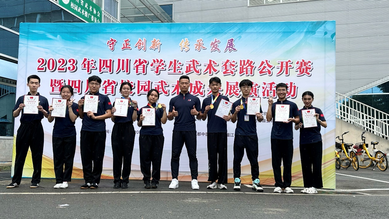 在四川省学生武术套路公开赛暨四川省校园武术成果展演活动中,由郭泽儒老师带领的校武术代表队参与男子八极拳、螳螂拳、长拳、南拳、虎拳、咏春拳、刀术、朴刀、八极枪与女子八极拳、八卦掌、虎拳、苗刀、朴刀、子午鸳鸯钺共15个项目,获得个人单项13金3银1铜的优异成绩。