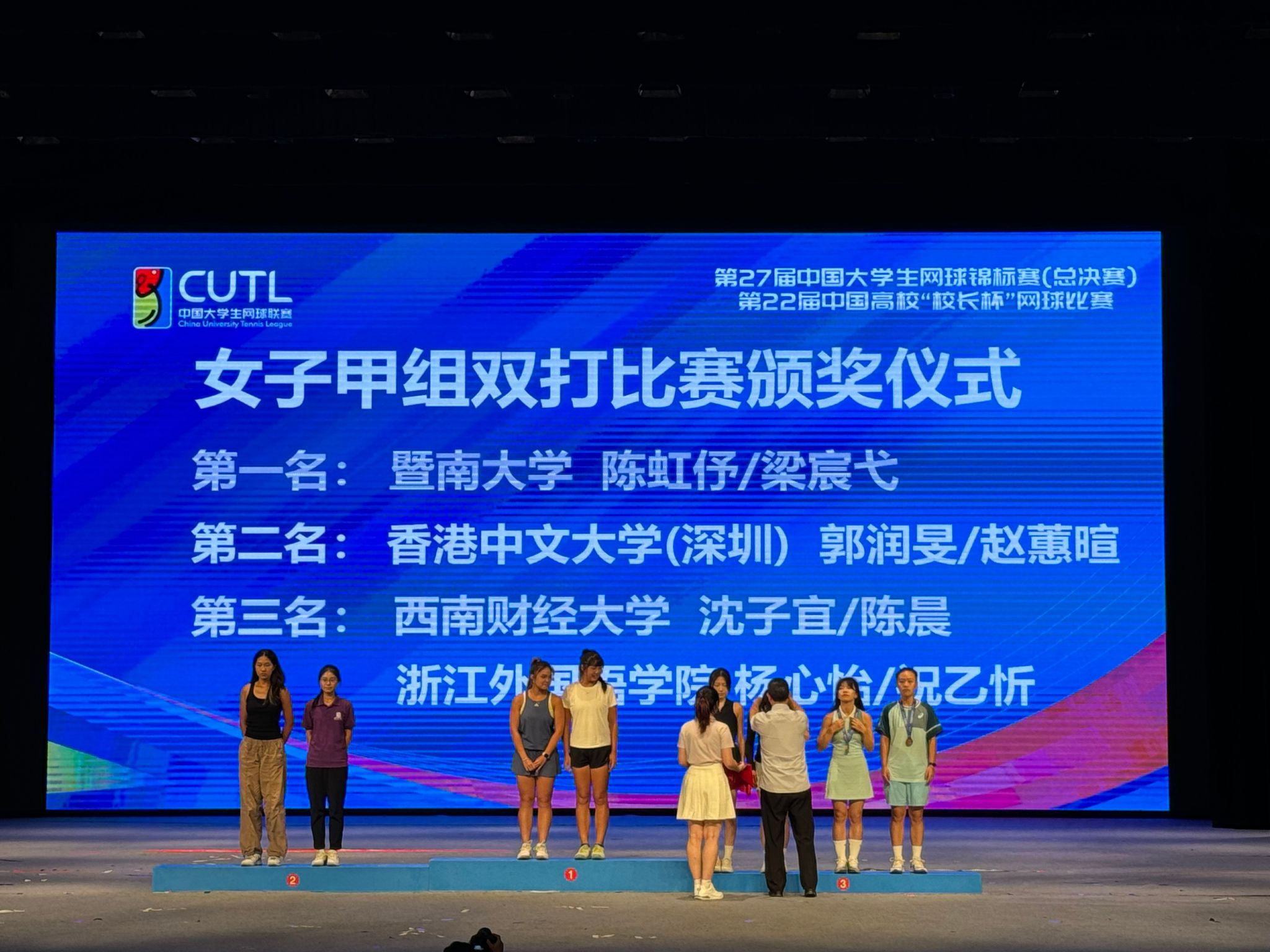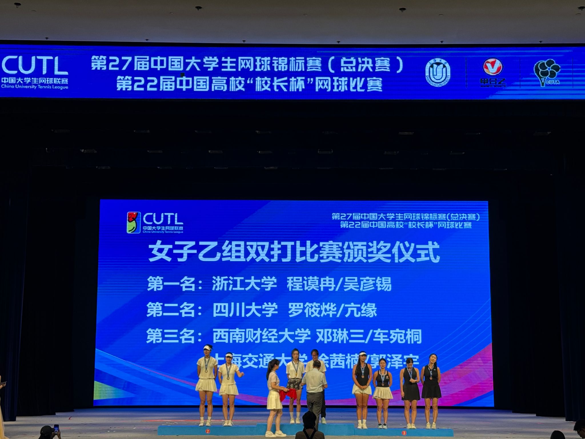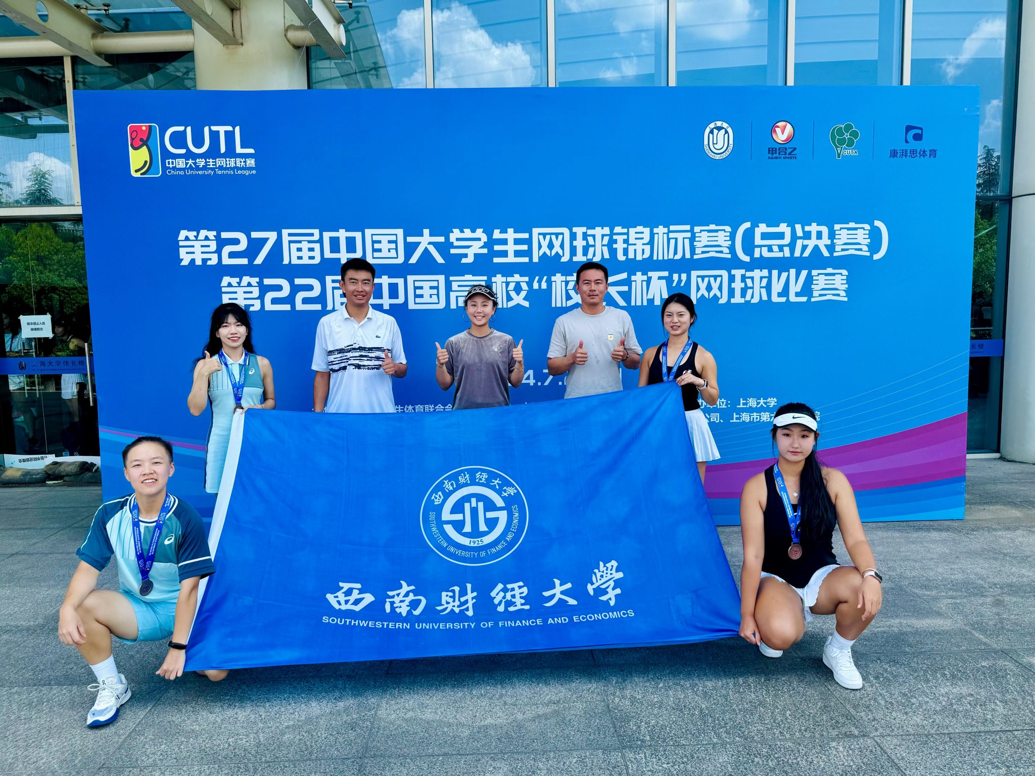 7月22日-8月1日,第27届中国大学生网球锦标赛(总决赛)在上海大学(宝山校区)举行。中国大学生网球锦标赛是我国大学生层面最顶级的网球赛事,经过八大分区赛的激烈角逐,在本届中国大学生网球锦标赛(总决赛)中,共有来自全国132所高校的915名同学成功晋级总决赛。参赛规模创历史新高!新利在线官网网球队在前期分区赛上表现突出,成功晋级总决赛,11名运动员代表学校参赛,孙巨杉、施泓宇、孔星宇担任教练。经过八天的激烈角逐,西财健儿们在强手如林的赛场上顽强拼搏,团结奋进,获得女子普通高校甲组双打季军和女子高水平乙组双打季军的好成绩,充分展现了西财学子的精神风貌和青春风采,为即将到来的西财百年华诞献礼!