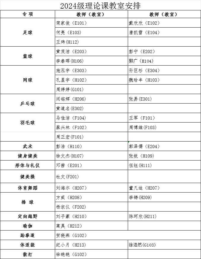 经教务处同意,本学期2024级本科生第3周体育课为新利在线官网理论课,9月29日起恢复户外教学。根据教室资源状况,现将理论课具体安排通知如下: